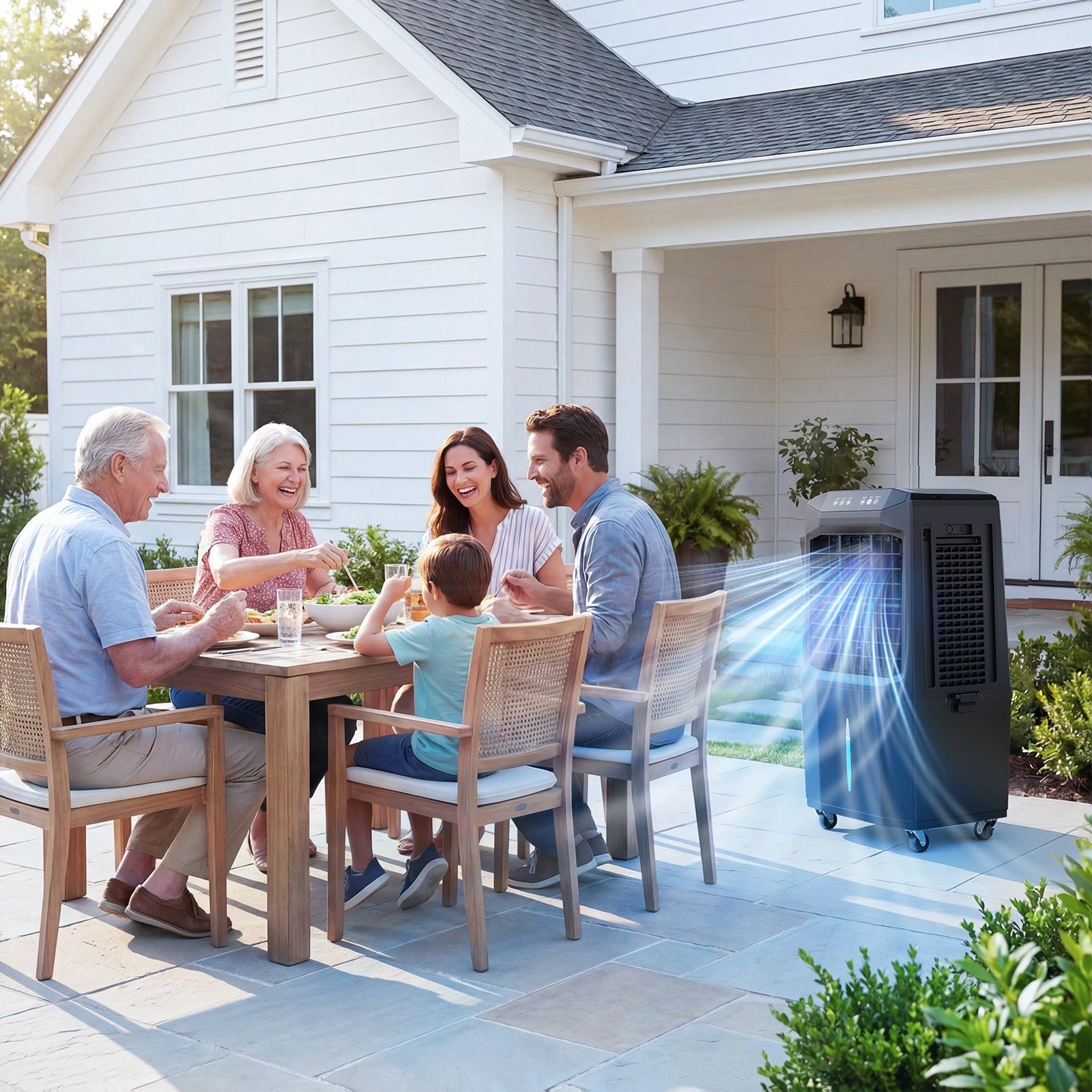 - 3-in-1 Multifunctionality - This 3-in-1 evaporative air cooler functions not only as a cooling fan but also as a humidifier or chiller, delivering fresh, moist air to lower indoor temperatures.