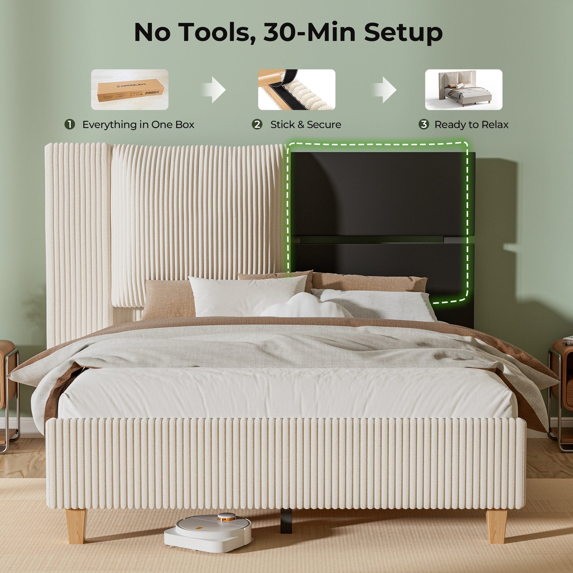 A5:The bed frame offers a 6-inch clearance from the floor. This is more than enough space for all standard robot vacuums (like iRobot Roomba) to pass underneath effortlessly, making cleaning hassle-free and keeping your bedroom spotless.